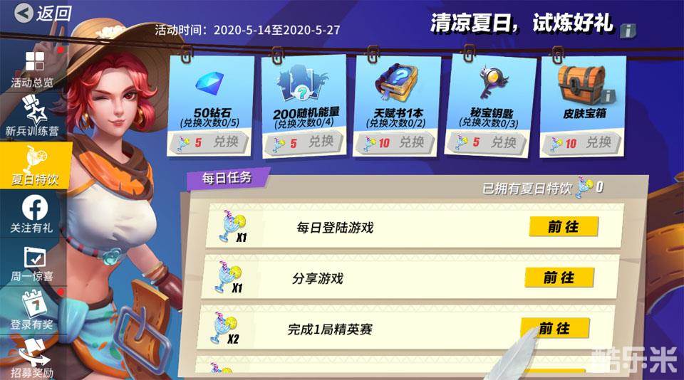 在5月14日至5月28日期间,《孤岛先锋》还为玩家准备了清爽到底的“夏日特饮”活动,玩家每日登录游戏或完成活动任务即可获得道具“夏日特饮”。收集一定数量的“夏日特饮”,即可在活动界面兑换丰厚奖励,包括:钻石 、英雄能量、天赋书、秘密钥匙、皮肤宝箱等道具,让你的试炼之旅更加畅爽!