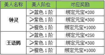 活动内容:活动期间内,拥有钟灵和王语嫣,且提升至目标品阶则可领取奖励。