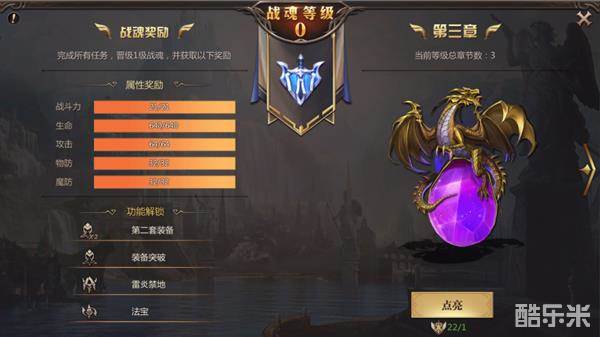 当战魂等级提升后,赶快去体验新玩法,因为这个时候提升战斗力的效率会非常高。比如战魂等级升级到1级时能够解锁第二套装备、装备突破、法宝系统和雷炎禁地(产出法宝材料),这几个系统能够让你轻松增加上百点战斗力,瞬间就能在PK中占据绝对优势。