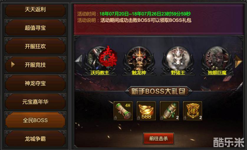 活动九:全民BOSS活动说明:活动期间成功击败BOSS可以领取BOSS礼包