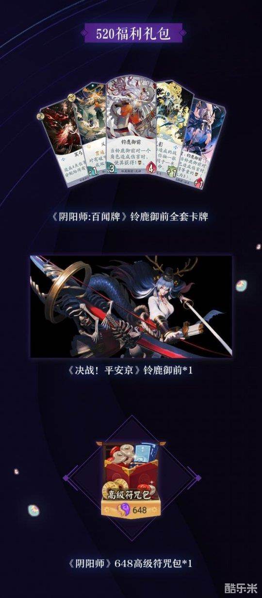 “海国锦鲤”可一人独享“520福利礼包”、“海国的邻居”、“海国的特产”与“海国旅游必备套装”四重福利。“520福利礼包”囊括《阴阳师:百闻牌》铃鹿御前全套卡牌,《决战!平安京》铃鹿御前式神,与《阴阳师》648高级符咒包。一次性畅玩三款游戏的铃鹿御前式神。