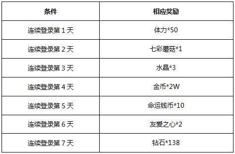 活动内容:活动期间内,每日登录游戏,即可在邮箱中领取:体力*150、七彩盾菇*5、精准指环*4、金币*30000哦~