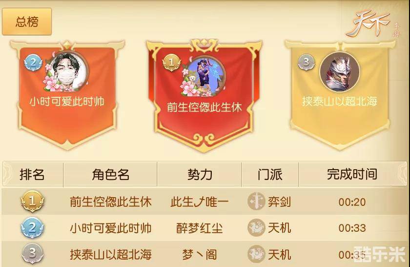 今日,不少《天下》手游的少侠为新玩法“碧海跳八石”伤透脑筋,轻功大神“七宝乄”分享了一则跳石攻略,所有门派均可使用:使用自由视角把镜头拉远,先后退一点起跳,二段跳跳到石头上,用左手向后拉一步,然后继续点三四段,点快一些很容易跳上去!排行榜上的各路神仙互不相让,都在尝试用最短的时间完成最高的难度,九合天下服务器的“前生倥偬此生休”更是只用了20秒就完成活动!在掌握技巧之后,你也可以轻松翻遍所有难关!