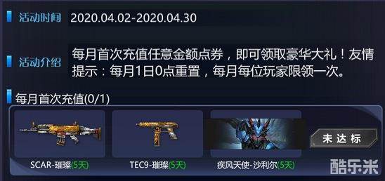 活动内容:玩家充值任意金额即可获得SCAR-璀璨(5天)、TEC9-璀璨(5天)、疾风天使-沙利尔(5天)豪华组合礼包