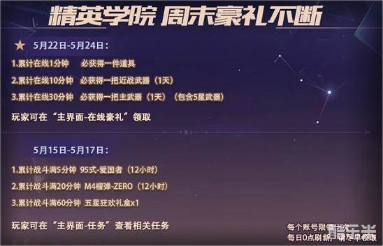 活动内容:5月15日-5月17日期间内,每日累计战斗时长完成周末任务,即可领取相应奖励。5月22日-5月24日期间内,累计在线一定时长,即可在主界面-在线豪礼抽取奖励。