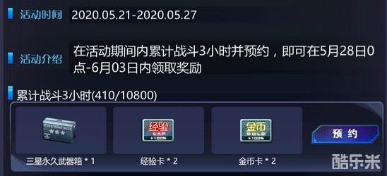活动内容:活动期间玩家累计战斗满3小时即可进行预约,在指定日期即可领取奖励。