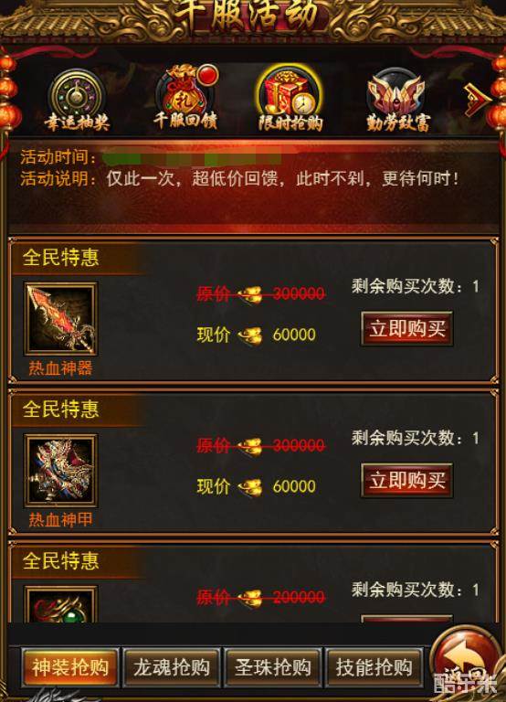 活动期间羽毛、龙魂、圣珠、特戒有VIP特权限时抢购里面,超低价回馈。