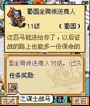 任务完成后您就获得《明珠三国》中的第一个坐骑——新手战马了!