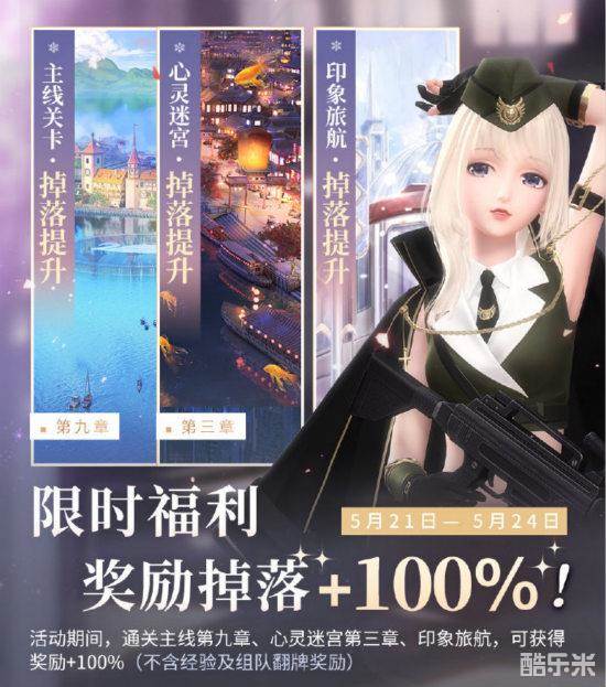 游戏还将于5月21日5时至24日期间,开启新一轮限时掉落提升,通关“印象旅航”、第三章心灵迷宫关卡、第九章主线关卡,将限时掉落金币、材料、衣服部件+100%。官方温馨提醒,限时掉落提升的奖励内容不包含角色经验和“印象旅航”组队翻牌奖励。