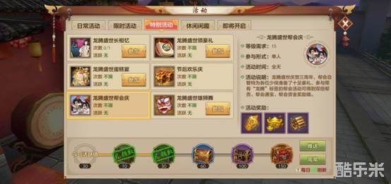 “龙腾盛世帮会庆”单单听这个名字少侠也就能猜到是和帮会有所关联的活动了吧,参与的少侠等级需要大于等于15级,只要参与带有“龙腾”标签的活动都可以获取当前任务双倍的奖励。