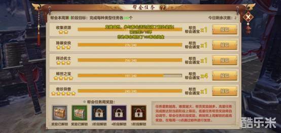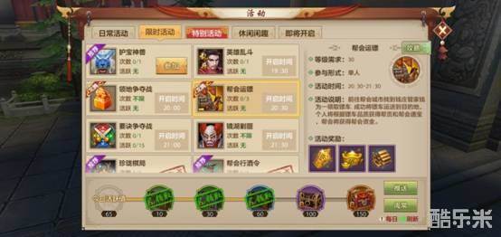 日常活动:帮会任务和帮会炼金。帮会任务随时随地只要登录游戏就可以开始做,只需要根据任务指引就可以。帮会炼金值得少侠注意了,帮会炼金是需要消耗活跃值的,也就是平时少侠做任务累积的。这里推荐少侠去搜索大金矿,因为双倍奖励较多而且还能得到额外的琼浆玉露奖励。每周喂养帮会神兽还能再得大量帮贡哦。