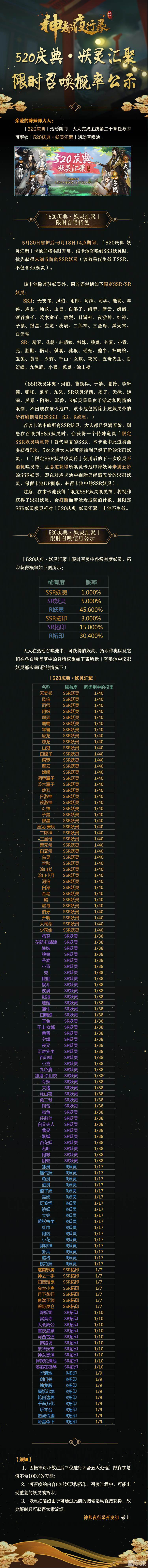 《神都夜行录》【概率公示】520庆典·妖灵汇聚 限时召唤概率公示