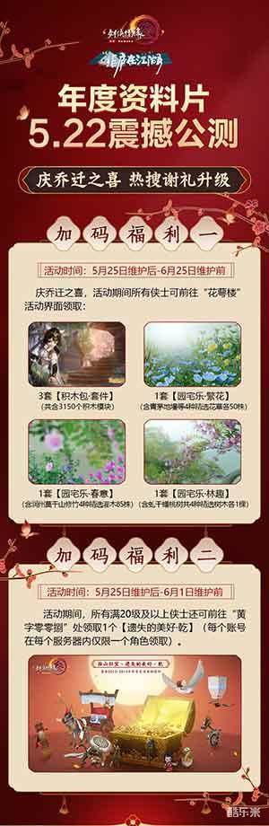 为庆乔迁之喜,除了公测首日的诸多福利好礼外,《剑网3》惊喜再加码!今日维护后至6月25日维护前,所有侠士登录游戏即可前往“花萼楼”活动界面领取3套【积木包·套件】(共含3150个积木模块)、1套【园宅乐·繁花】(含青茅地墁等4种精选花草各50株)、1套【园宅乐·春意】(含润州莫干山修竹4种精选灌木85株)、1套【园宅乐·林趣】(含虬干蟠桃树共4种精选树木各1棵)!精致园艺组件登录即可领取,为新家添砖加瓦!