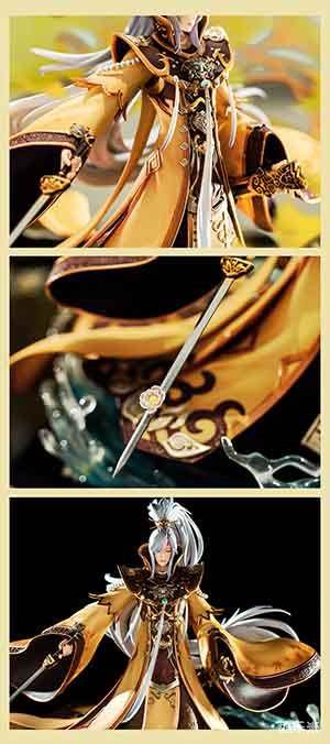 本次重制的藏剑山庄大庄主“叶英”等比例手办,手办尺寸高约26.8cm(含底座),人物高度还原,双目轻闭,面色素雅,仿佛正在领悟无上剑意。服装及剑鞘上的装饰花纹细节十足,匠心工艺。执剑在手,剑随心动,会当击水千里。发丝呈现,细节分明,银丝舞动,裙衫飘逸。
