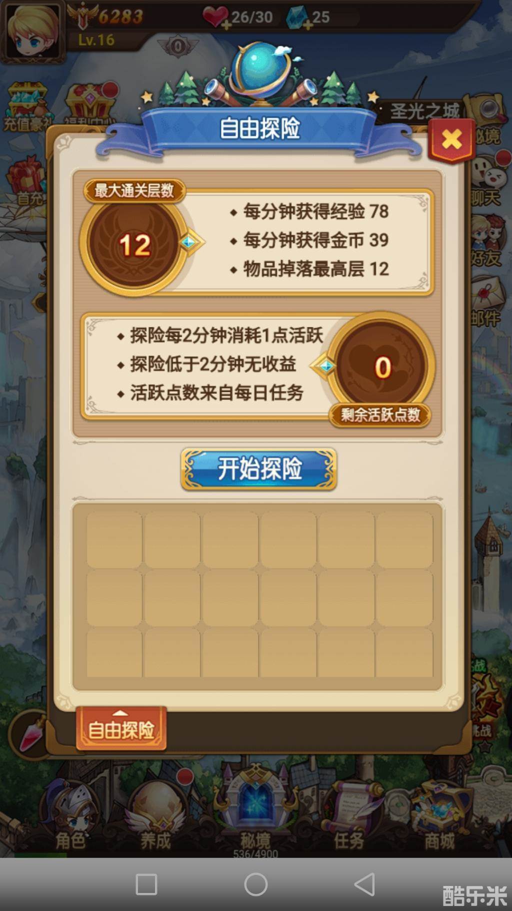 探险功能就像个挂机系统一样,由每任务来获得活跃,消耗活跃来获取经验和金币,并且还会掉落物品,物品的掉落最高层就是玩家当前所打到的层数。
