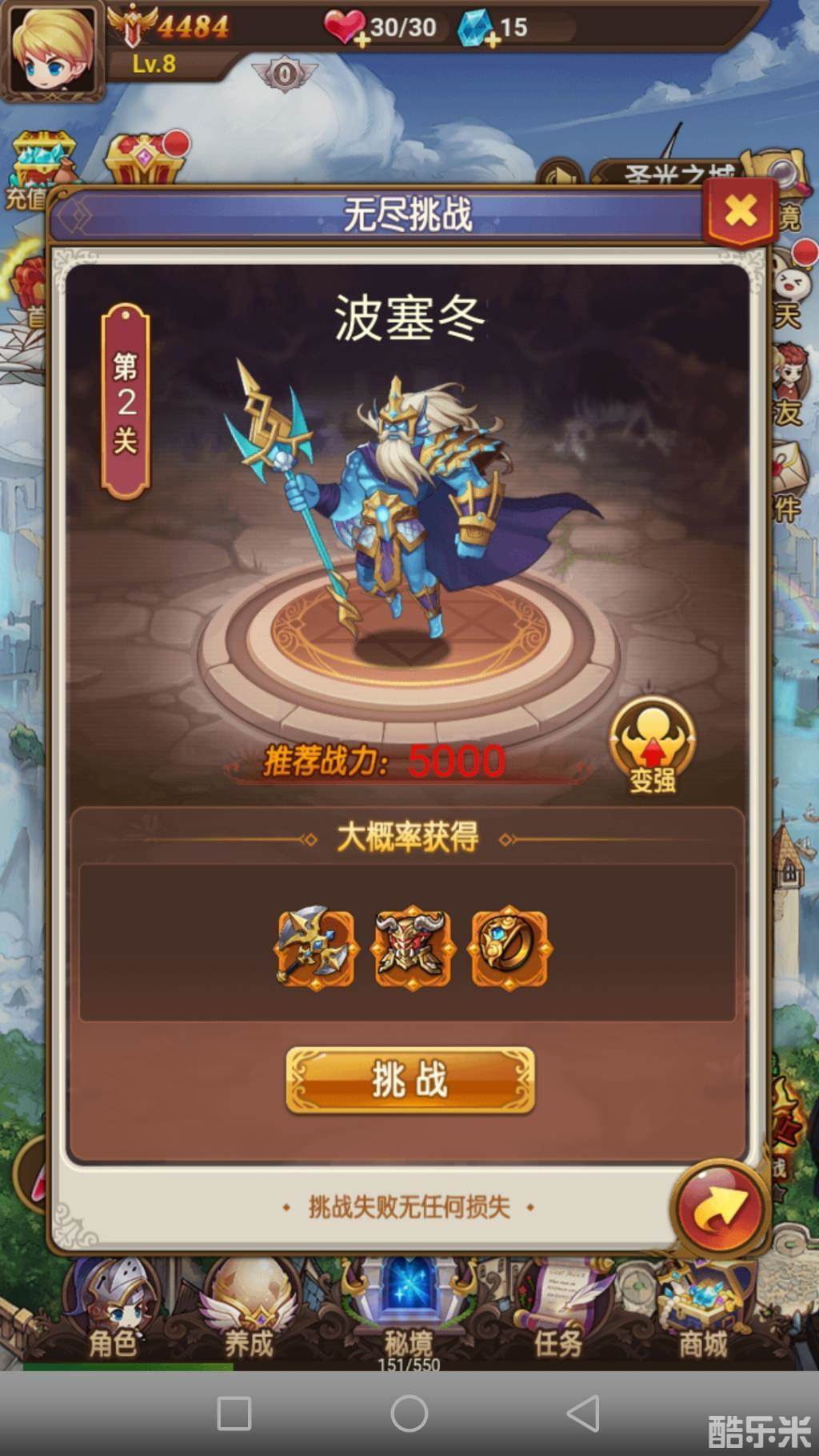 这个挑战是小编最喜欢的,失败无损且可以得到非常牛的装备,当然BOSS也很强,所以推荐战力这个还是不用考虑了,最少高1倍,不然打的会很吃力。