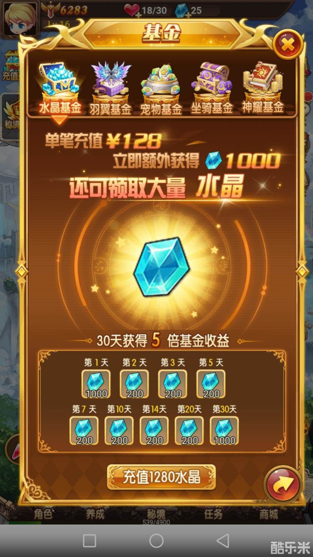 这个充值系统比较有意思,更以往的不太一样,可以说别的游戏有的他都有,别的游戏没有的他也有,而且充值的途径真的是太多了。比较有特色的如下面这个基金系统,充值领水晶并且还可以每隔一段时间领一次。然后首充又给屠龙剑等等。其实小编觉得一个首充就够了,不需要投入太多,当然土豪除外哈。