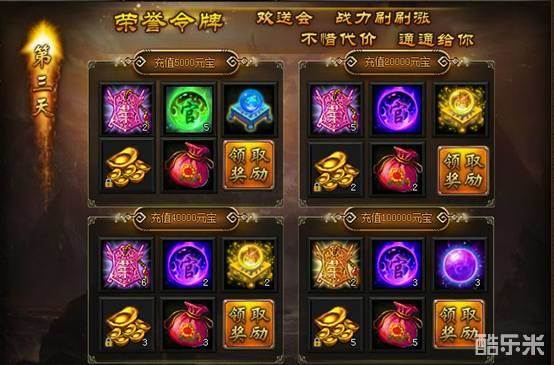 【活动内容】:开服活动期间,每天充值元宝数额达到1000、10000、30000、50000元宝时,分别可领取一份丰富的奖励,每天的奖励内容都不同哦!