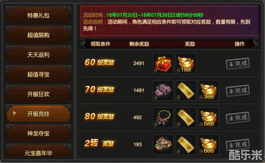活动六:开服竞技活动说明: 活动期间,角色满足相应条件即可领取对应奖励,数量有限,先到先得!