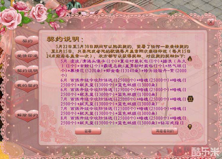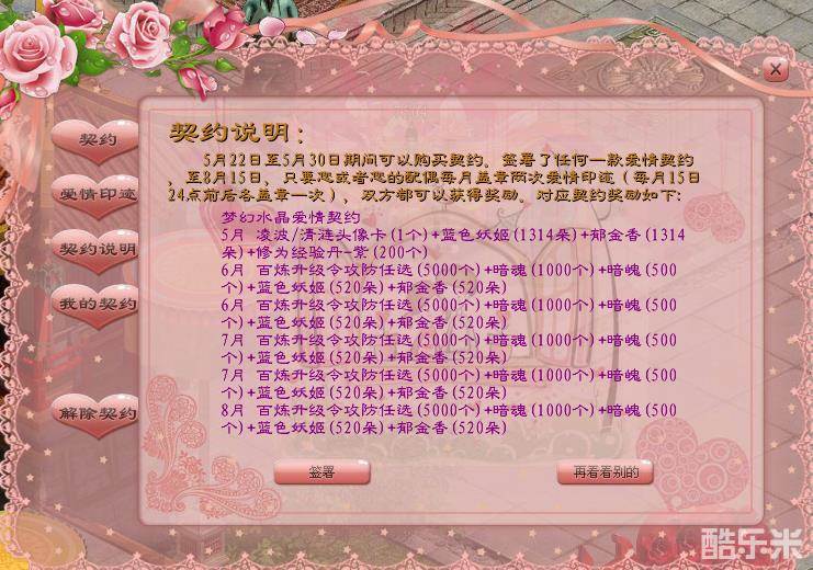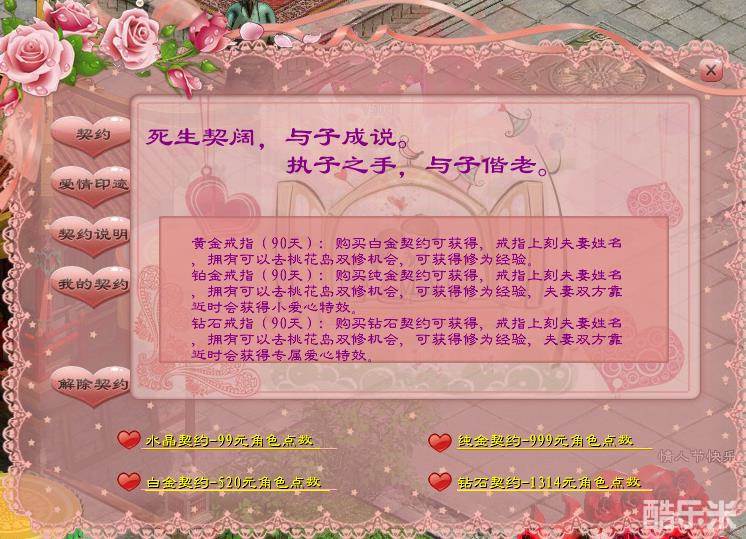 活动期间,玩家可在NPC民政官处,使用角色点数购买99元水晶契约,520元白金契约,999元纯金契约,1314元钻石契约。