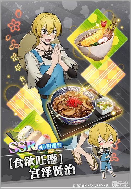 最后要介绍的就是最近即将开启的异能节活动中,全新登场的宫泽贤治SSR卡牌【食欲旺盛】宫泽贤治!这张卡上画得非常精致的牛肉、炸虾、饭团等料理,也确实能让人有食欲大增的感觉。