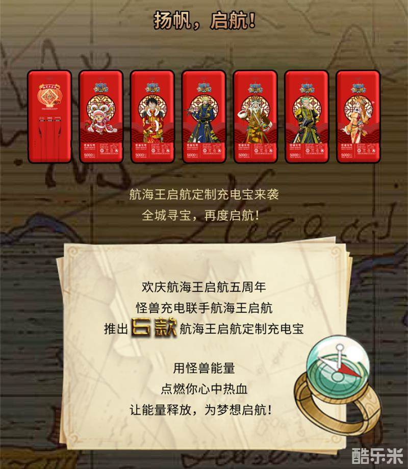 本次五城寻宝之旅将于5月22日开启,并持续两周时间。含有《航海王启航》草帽一伙六名角色形象的定制充电宝将被投放到城市各处的怪兽充电站,等待寻宝者们发现!