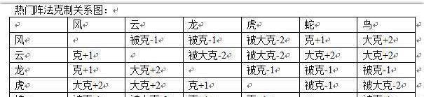 热门阵法评分克制评分:风-1/云+1/龙0/虎+2/蛇-2/鸟-2。