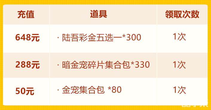 少年们单笔充值指定金额,即可得到陆吾彩金五选一、暗金宠碎片集合包、金宠集合包等资源!少年们千万不要错过哟~