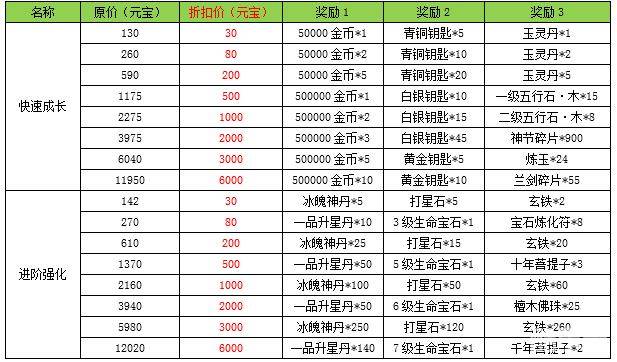 l 活动内容:玩家可以通过较低的元宝获得更高价值的成长道具和强化道具。