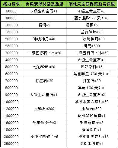 l 活动规则:新服放利活动,增加战力奖励,符合条件的玩家可免费领取,消耗一定元宝还可领取进阶好礼,进阶好礼仅需1次绑定元宝解锁。