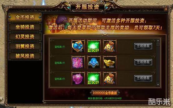 【活动内容】:开服活动期间,可激活多种开服投资,激活后,每天登录即可领取丰厚的奖励,