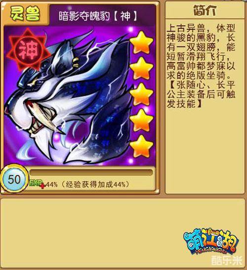 光看名字小编都已经合不拢腿了,这么狂霸酷炫拽的坐骑简直是把妹利器。同时暗影夺魄豹自身还有属性——“经验加成5%”,在卡牌满级转生成“神·暗影夺魄豹”后,该属性将提升至“经验加成44%”。