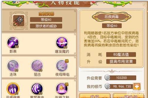 恶疾病毒:利用暗器使1名敌方单位中恶疾病毒,6回合。目标中毒期间,受到的伤害增加30%;目标在中毒期间死亡,恶疾病毒将传染给1名随机敌方单位;剩余持续回合数不变;每次传染都能提升恶疾病毒的效能