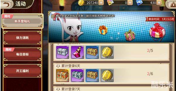 在妖精的尾巴无尽冒险中有活动专区,有新手登陆礼,体力消耗,每日目标以及开工福利四大块。