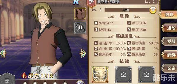 在妖精的尾巴无尽冒险中马克思不会主动攻击,以拖住对方为主,马克思的属性生命值477,防御43,速度230,暴击率达到15%,暴击伤害50%,命中率100%,闪避率,效果命中以及效果抵抗均是0。相比于之前的艾尔夫曼,马克思的实力就略显青涩。毕竟马克思是R级别的魔导士。
