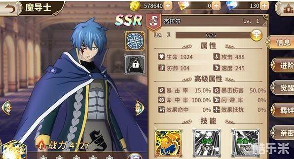 在妖精的尾巴无尽冒险中,杰拉尔的属性生命值是1924,防御104,速度245,攻击488,暴击率达到15%,暴击伤害50%,命中率100%,闪避率,效果命中以及效果抵抗均是0。
