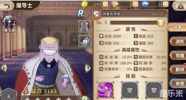 魔导士纳鲁布亭格的技能是针刺旋转:双手长出大量的针刺,旋转自身攻击敌人。对敌人造成95%的伤害,提升己方魔导士8%的暴击率,持续1秒。因为在游戏中,纳鲁布亭格的等级是R,所以目前只有这一个技能。