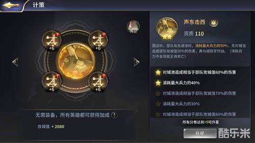 “声东击西”的意思是声张击东而实击西。此计用以迷惑敌人,造成敌人错觉,给敌人出其不意的攻击。在《三十六计》手游中,如果使用此计策,攻击城池时,先消耗最大兵力的50%攻打城池(造成部队攻城值50%的伤害),再与城防军作战。先攻城再杀敌,使得平民玩家在国战中的战斗力大增!