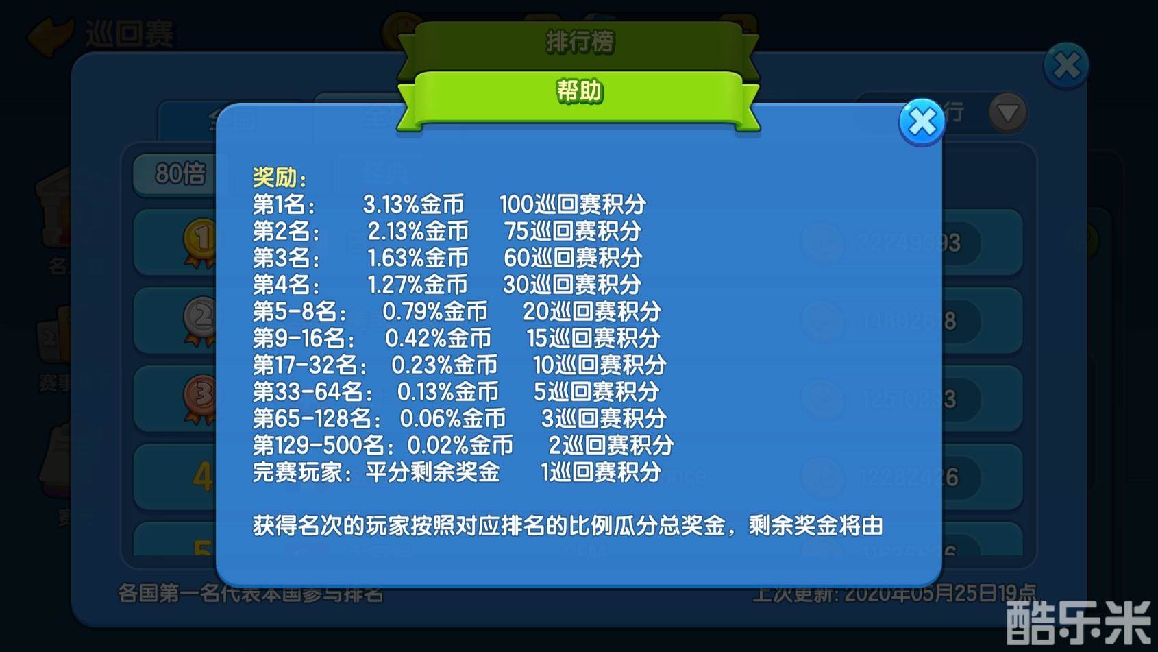 周赛总奖金50万,获得名次的玩家按照对应排名的比例瓜分总奖金,剩余奖金由所有的完赛玩家(10个欢乐场单人和5个经典场单人都有分数,包括获奖玩家)平分。