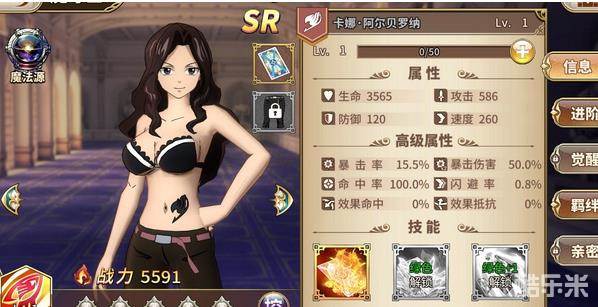 在妖精的尾巴无尽冒险中,卡娜的属性生命值是3565,防御120,速度260,攻击586,暴击率达到15%,暴击伤害50%,命中率100%,闪避率,效果命中以及效果抵抗均是0。