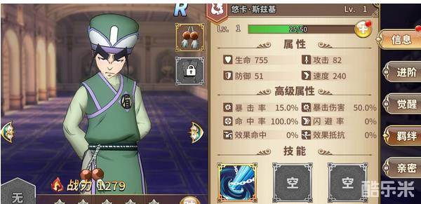 个人认为悠卡是一个比较有内心戏的魔导士,悠卡属性生命值755,攻击82,防御51,速度240,其中,高级属性中暴击率达到15%,暴击伤害50%,命中率100%,闪避率,效果命中以及效果抵抗均是0。通过提高经验值,相应的属性也会提到提升。