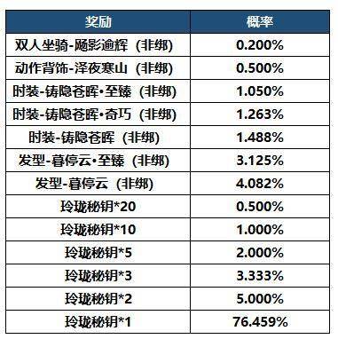 《剑侠世界2》手游【玄甲风尘】奖池概率如下: