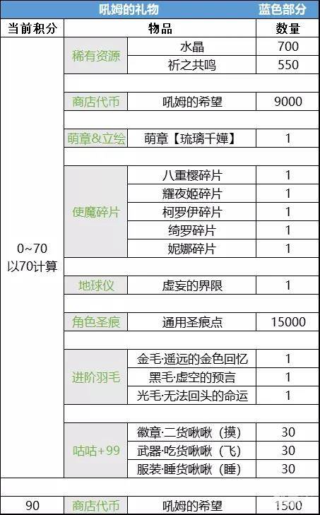 蓝色部分的奖励是玩家普遍可以获得的,只要跟随活动进行,至少70个积分是相对容易的,首先来看蓝色部分的主要奖励: