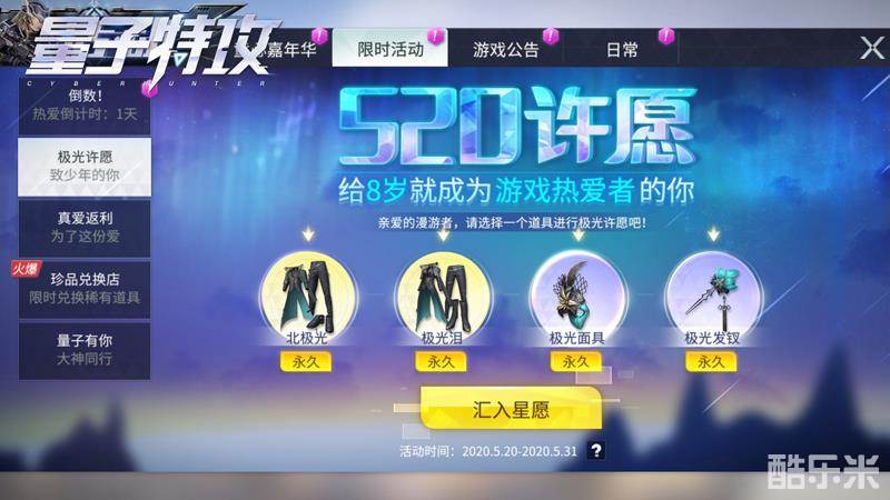 《量子特攻》520特别活动中,漫游者们只需要在北极光、极光泪、极光面具、极光发钗之中任选其一,就能许下自己的独特星愿!此后,漫游者们参与到阵营对决、六军闪击战等各类玩法中,就能完成任务收集星愿币:每天累计竞技场数、邀请好友助力等,同样会送上星愿币,只要达到指定数量,许下的星愿就能实现,把永久时装、外观带回家!