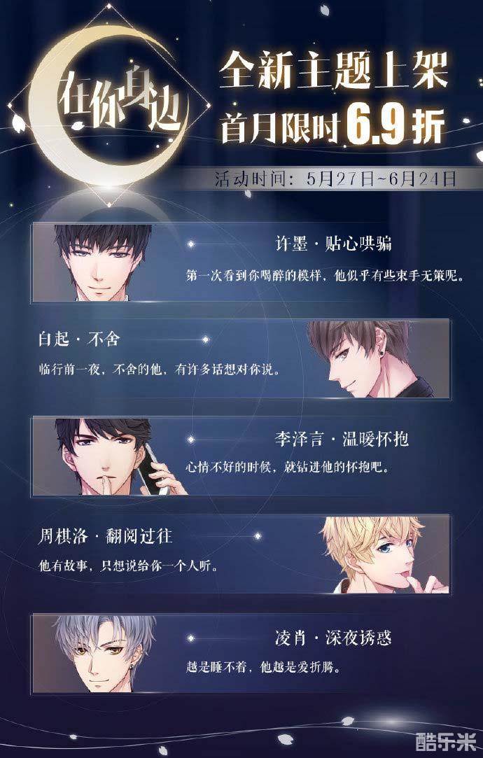 此次活动更新后,登录游戏即可免费解锁五位角色【初始服装】的Live2D动态,触碰、拖拽、来回抚摸,会触发角色的不同动作与反应,解锁和他的亲密升级。该服装动态可以设置到主界面,已达成目标的生日服装Live2D动态也将在后续版本中推出。同时,全新主题【在你身边】上架,制作人可前往试听他说给你一个人的悄悄话。