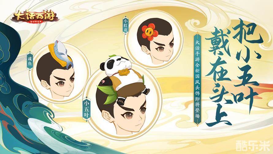 百变头饰,小五叶驾到!《大话西游》手游时装系统再添新内容,全新国风头饰即将登场!萌趣小五叶、小咸鱼、小红花……老铁熟悉的它们将纷纷化身特色头饰,为侠士们的颜值再添亮眼一笔!
