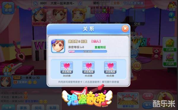 与好友组队游戏时可以提升亲密度,而亲密度等级会对游戏有加成效果,也是玩家之间结为密友和情侣的条件之一。在房间内可以点击对方模型后可打开关系界面,使用亲密卡后可以直接增加双方的亲密度。