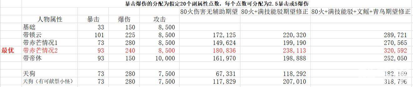 灵器部分:地人和锁死青惑清瑶(视情况换灵曜)雷师,白净状态大招由于自身有被动不太缺暴击,天带赤芒堆暴击爆伤即可(暴击也要适量);玄羽状态天带赤芒,且副属性堆满暴击的情况下为最优,天带锁云,副属性堆攻击爆伤也可,但稍差于前者。存在增伤辅助,赤芒堆不满暴击或带帝休的伤害收益期望见下表