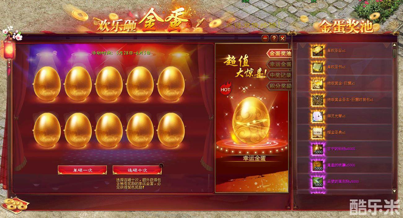 本期活动奖池:大奖——皇权圣旨、皇权圣书、坐骑-绝版黄金-巨蟹、时装-绝版黄金圣衣-巨蟹、御灵光辇、璨金圣典;