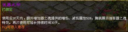 金蛋积分奖励——优器之印,技能效果为:使用后30天内,额外增加器之魂提供的增伤、减伤属性50%。脚底展示独有器之魂特效。再次使用可延长持续时间30天。(每消耗一个金锤增加10点累计积分)。